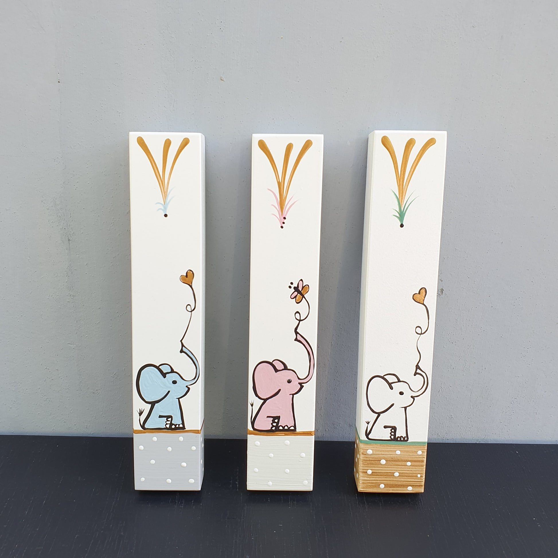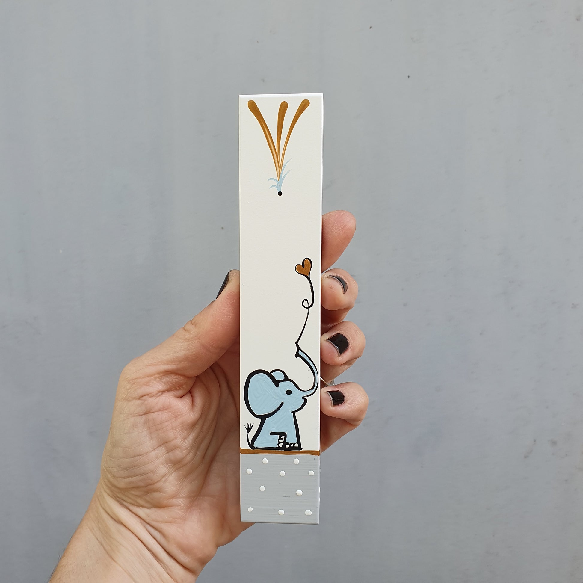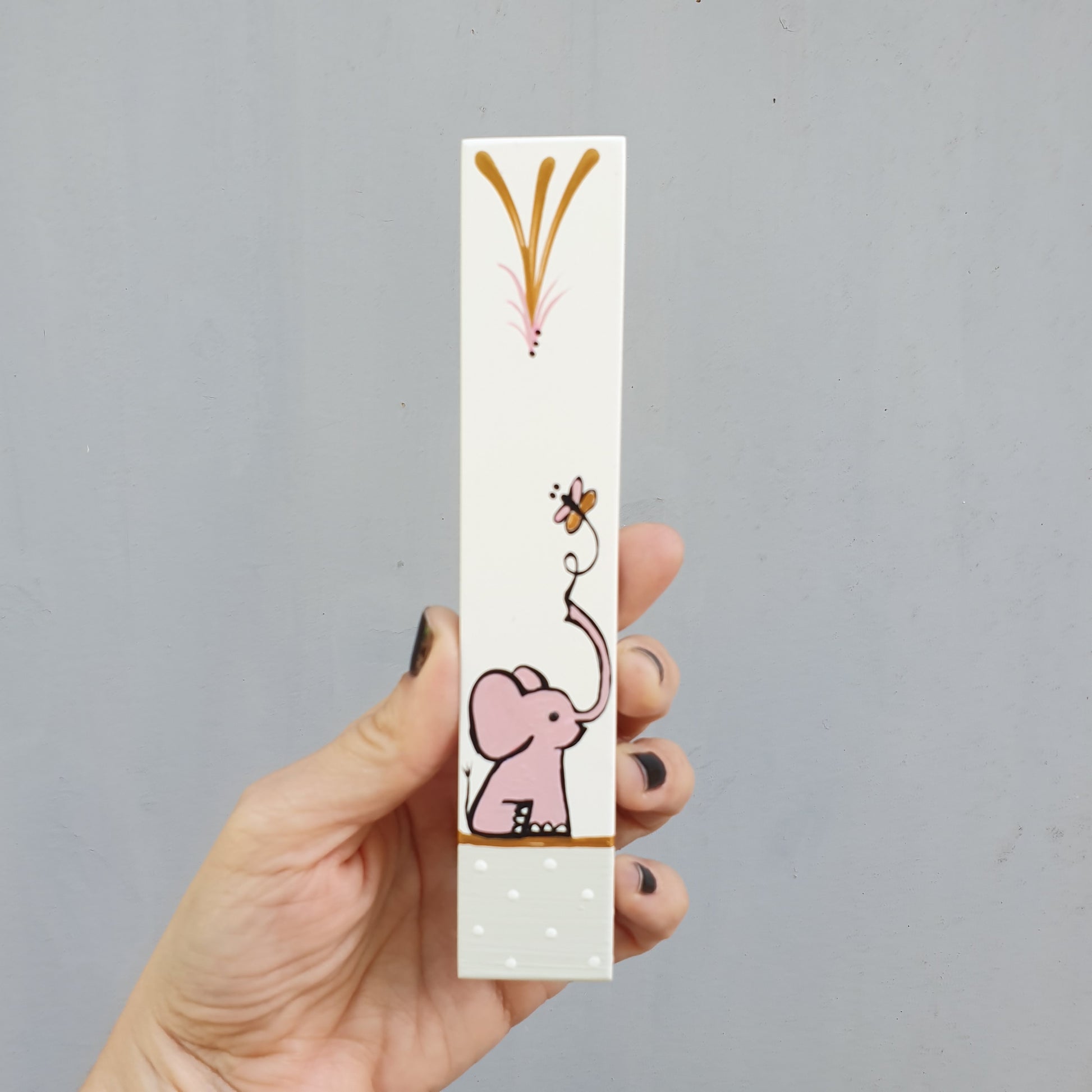 מזוזה לחדר ילדים מצוירת בעבודת יד עם איור עדין של פיל קטן וצבעים רכים שמתאימים לחדר תינוקות וילדים.