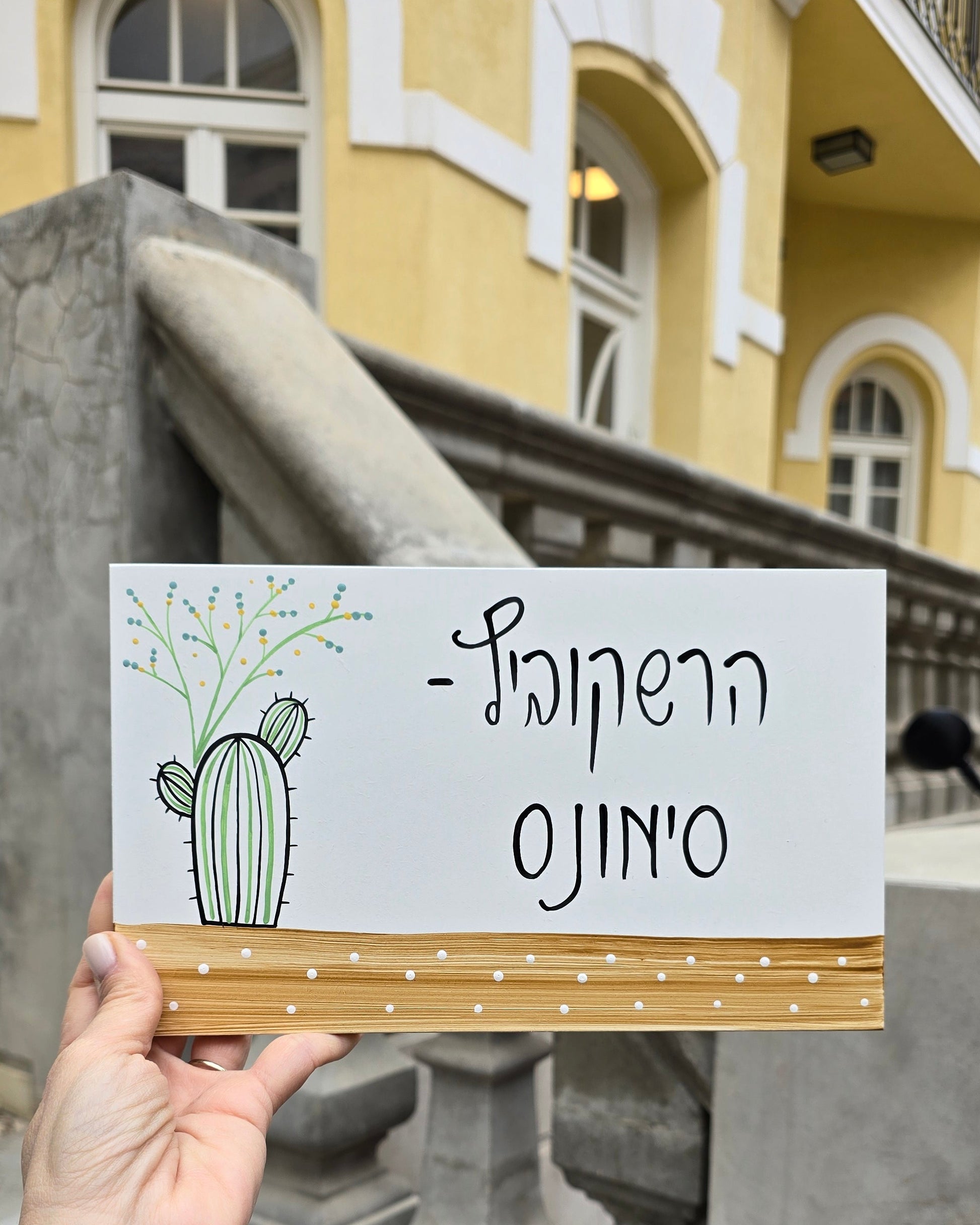 שלט לדלת כניסה עם קקטוס מצויר וכיתוב אישי